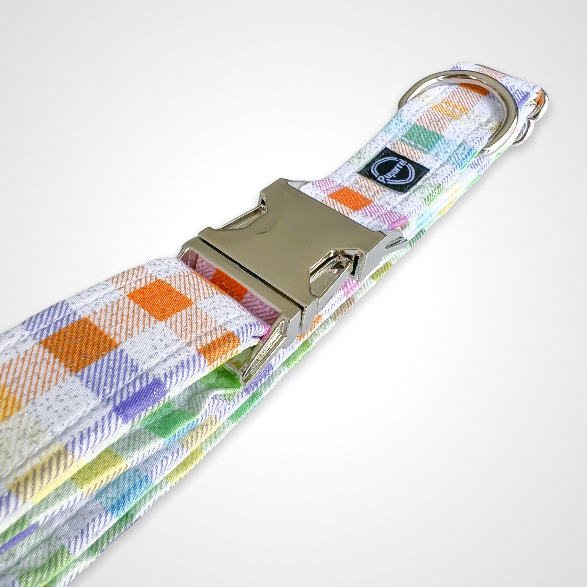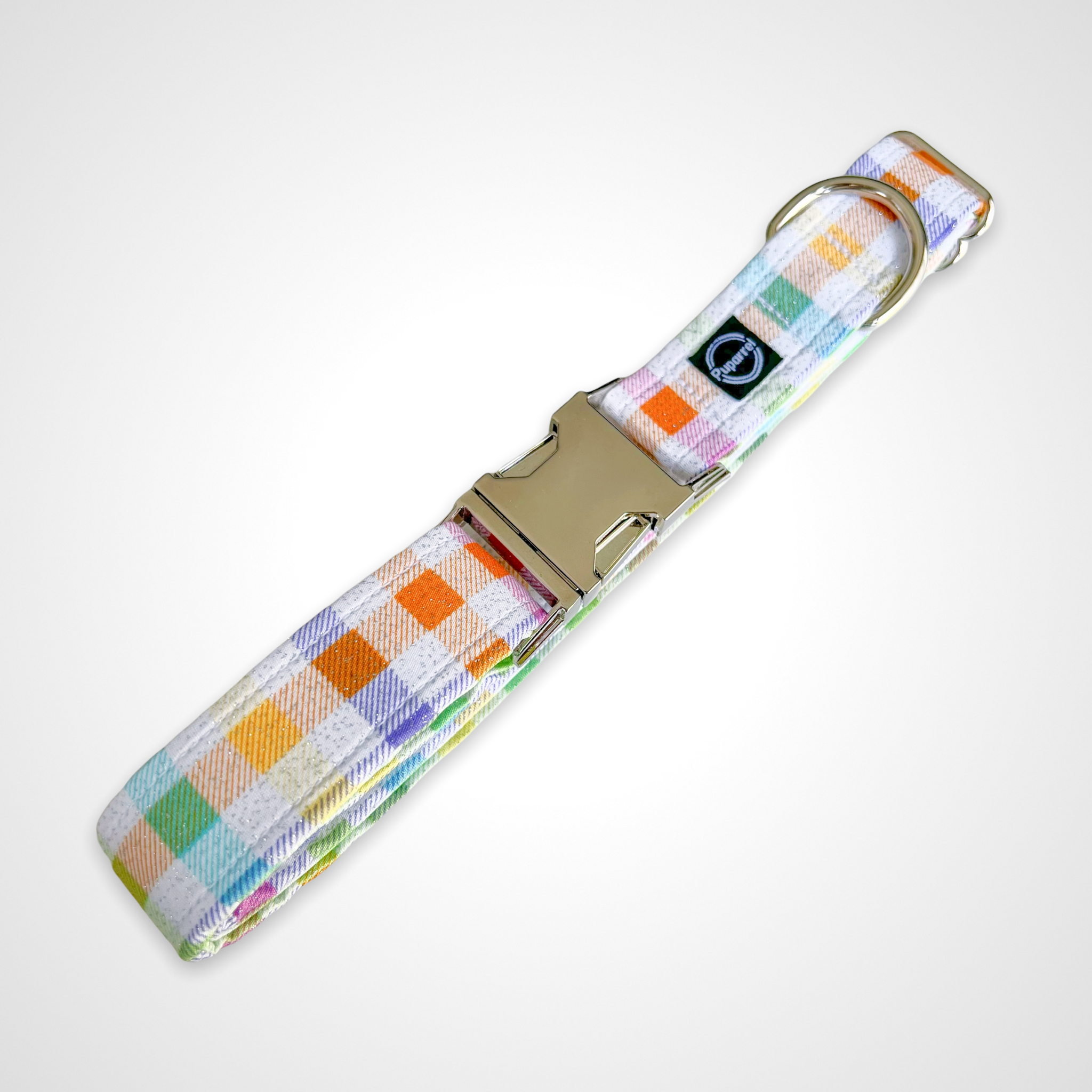 - Gingham pattern made up of shades of orange, yellow, green, blue, purple, and pink
