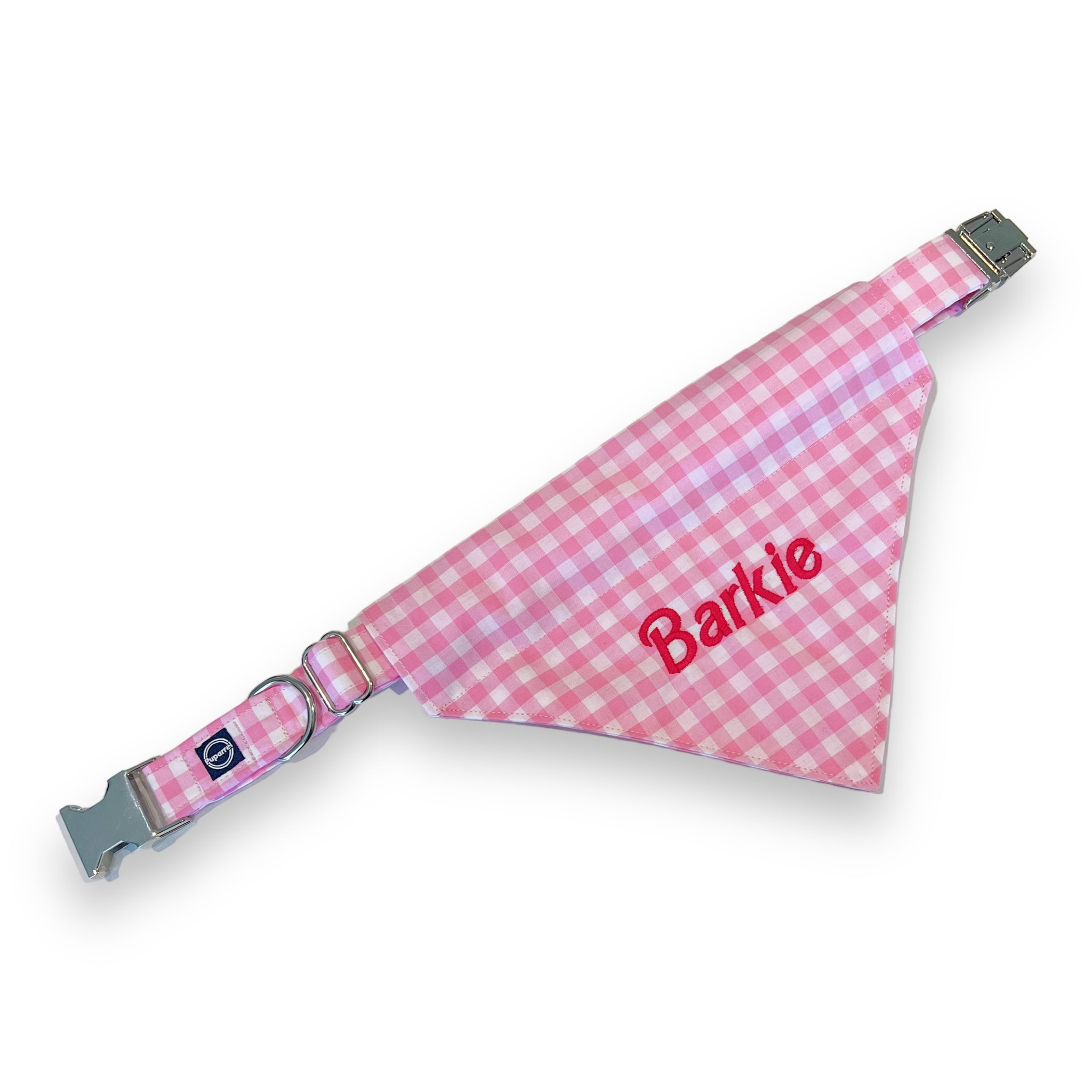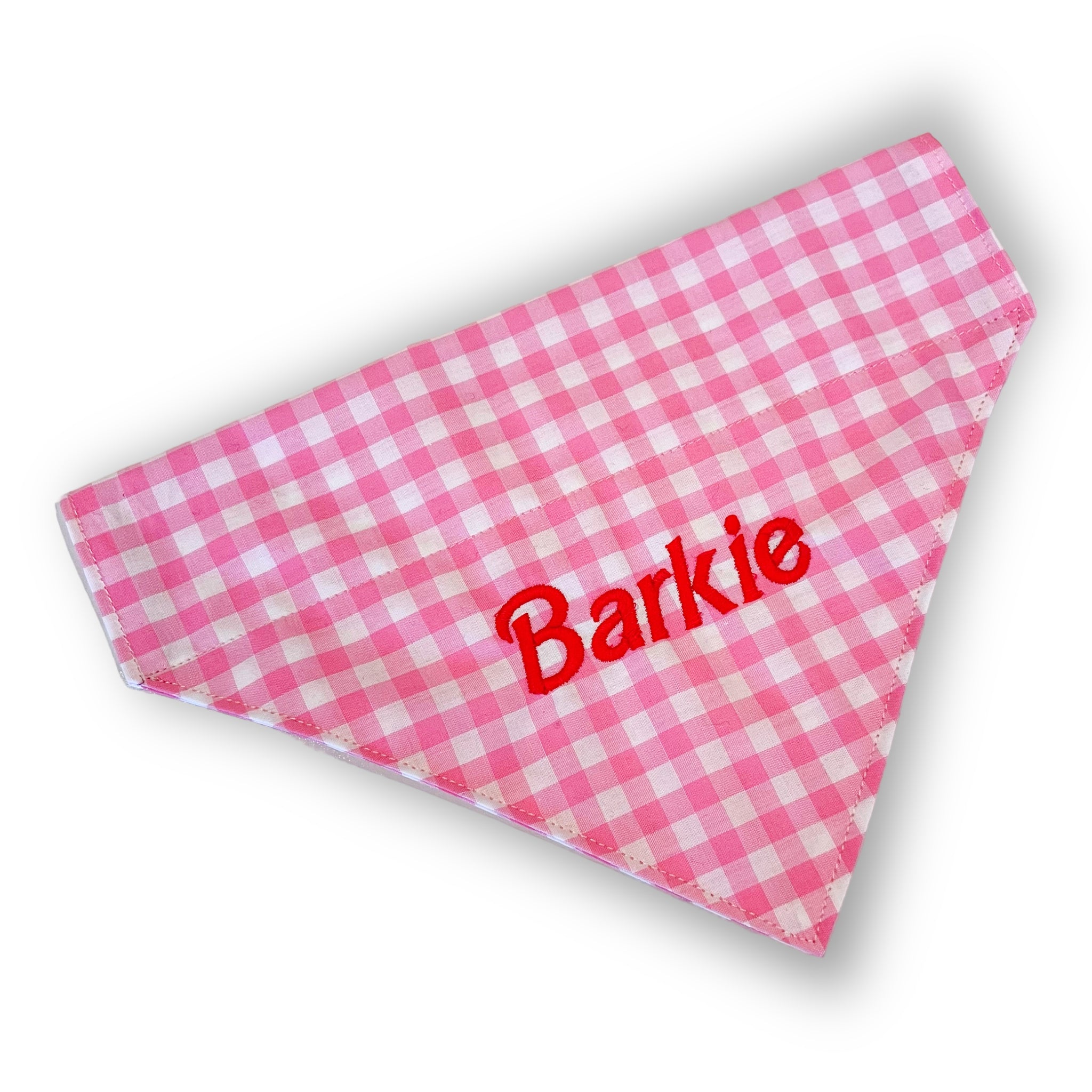 - Embroidered on front with 'Barkie' in hot pink